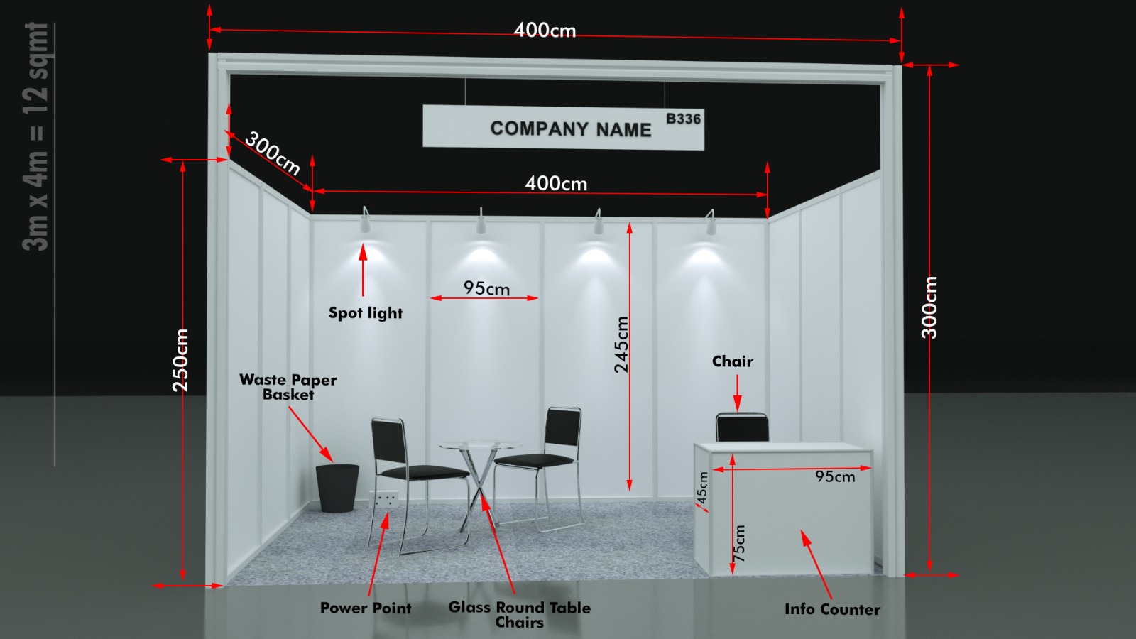 Includes: Octonorm Wall Panels, Synthetic Carpet, Fascia in English, 1 Spotlight per 3 sqm., One 5 amp socket per 12 sqm., 1 Counter / Table, 3 Chairs, 1 Glass Top Round Table, Basic Single Phase Electricity for stand lighting, General Security, Stall Cleaning & One Expo Directory.